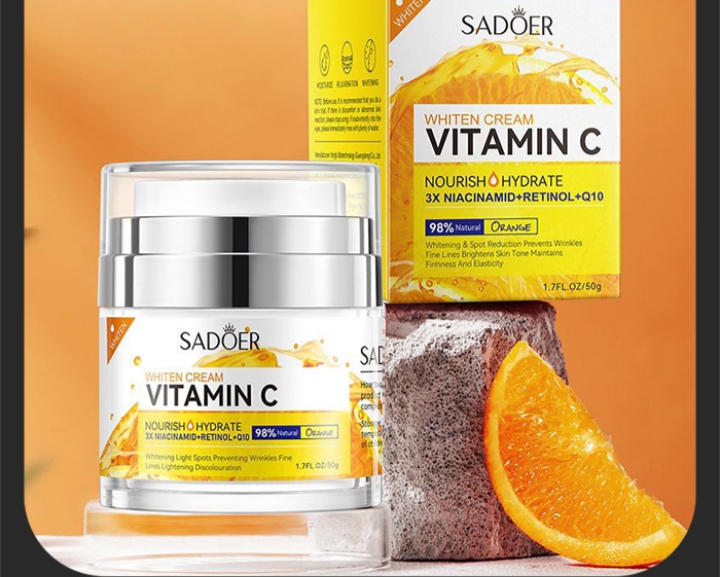 کرم صورت پمپی سفید کننده 3x ویتامین سی سادور 50 گرم کد sd02396 کنترل ملانین پوستی و حاوی نیاسینامید، ویتامین سی، رتینول و Q10 و حاوی 98 درصد عصاره طبیعی پرتقال مناسب بهبود لک های پوستی می باشد