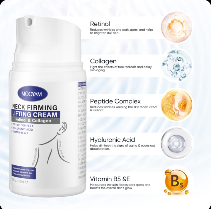 بدون جعبه با قیمت اقتصادی حاوی رتینول و کلاژن پلی پپتید و هیالورونیک اسید ،ویتامین B5&E رفع خطوط ریز گردن مغذی پوست و ترمیم کننده بازگشت حالت کشسانی به پوست مرطوب کننده پوست گردن جوانساز کرم لیفت و رفع چین و چروک گردن مویام پوست خودتان را بشویید سپس مقداری از کرم را روی پوست گردن بزنید و از پایین به بالا ماساژ دهید تا جذب شود . برای تاثیر بهتر دوبار در روز استفاده کنید.